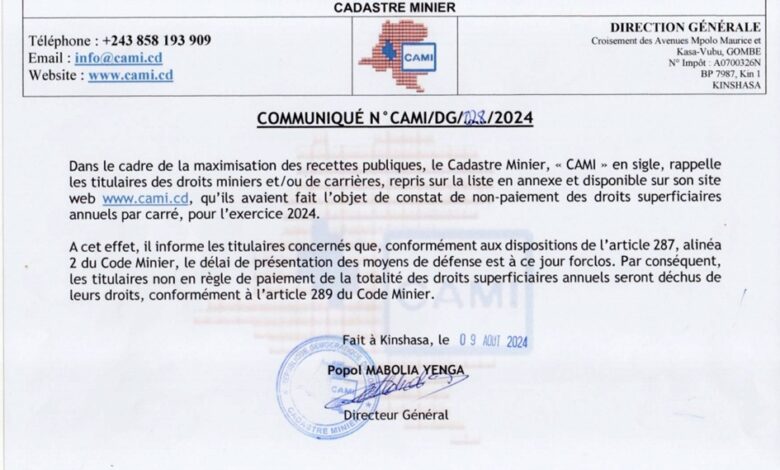 Communiqué de CAMI n°028/2024 relatif aux titulaires des droits miniers et/ou de carrières non en règle de paiement de la totalité des droits superficiaires annuels.